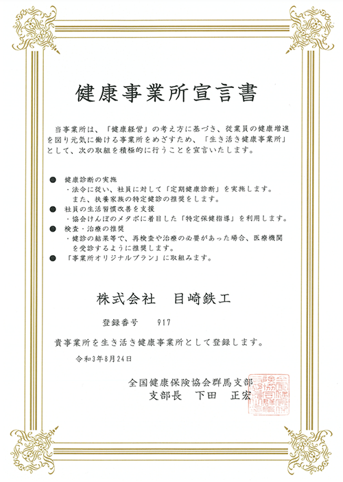 株式会社目崎鉄工は、「生き活き健康事業所」として次の取り組みを積極的に行うことを宣言いたします。